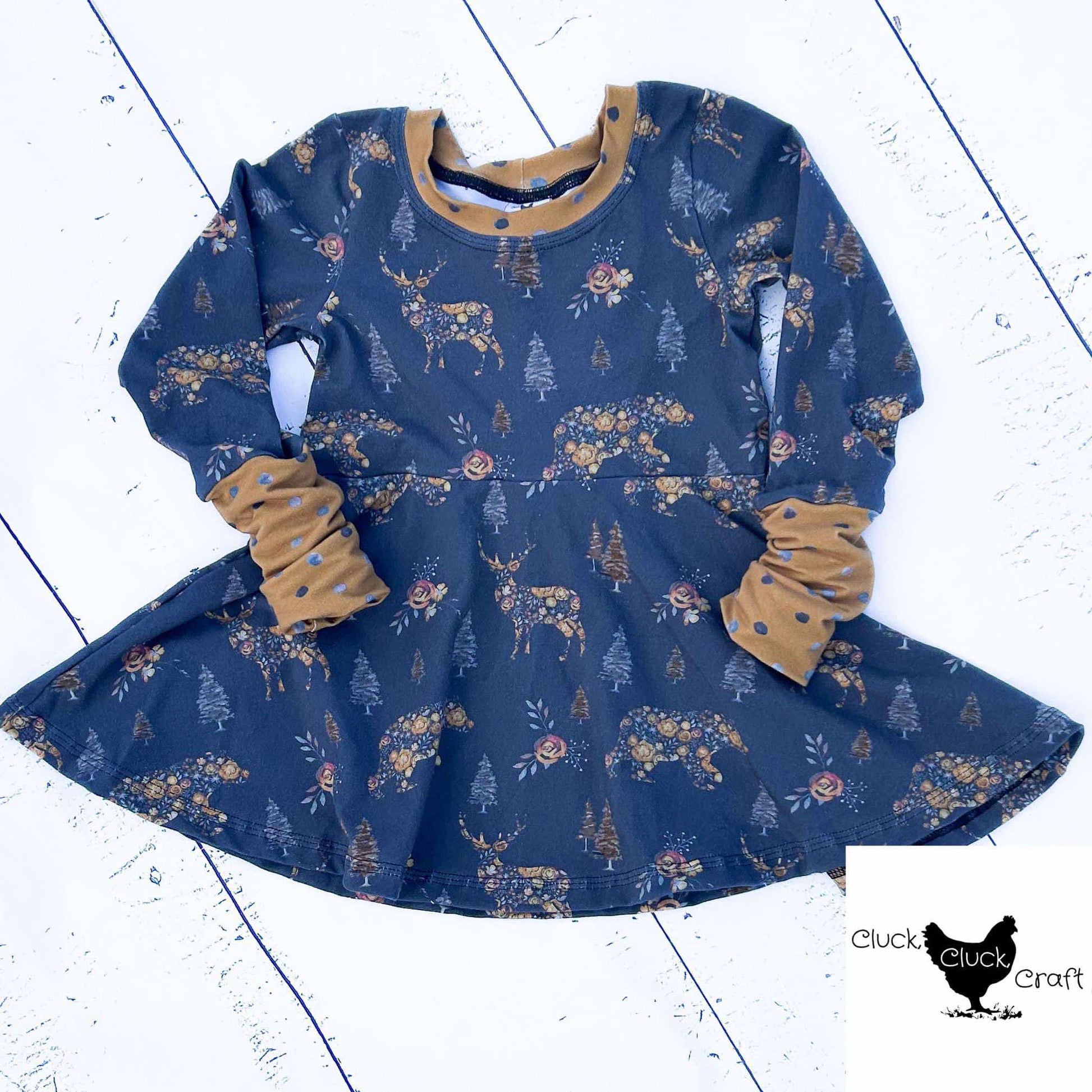 The Classic Peplum is a slim fit peplum. The Grow With Me style will fit looser and longer when your child fits into the lower size range (more dress-like) and more fitted as your child reaches the larger size (more shirt-like). The print is of glittery wildlife in a forest on a navy blue background. It is made of cotton spandex.